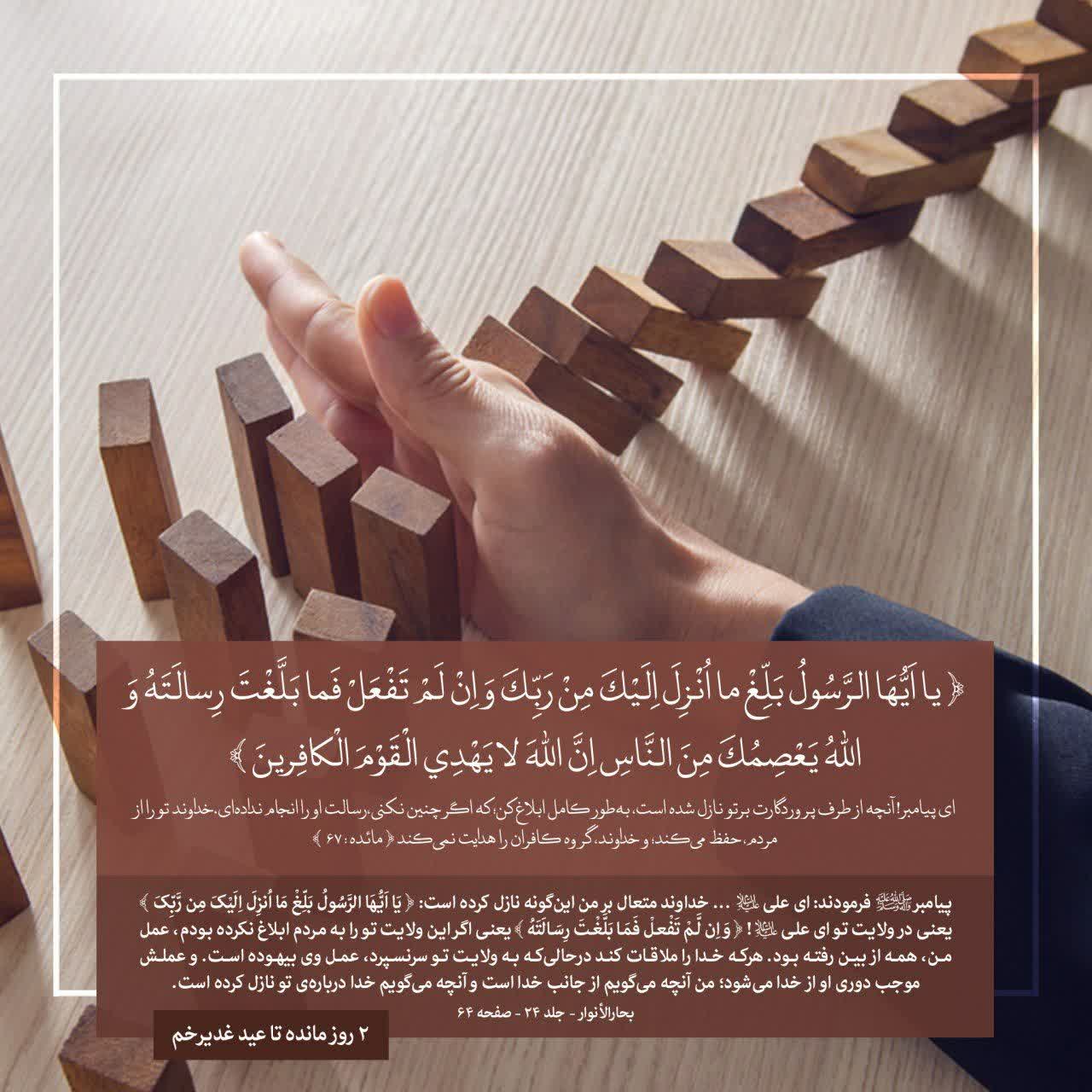 ✨ياأيُّهَا الرَّسُولُ بَلِّغْ ماأُنْزِلَ إلَيْكَ مِنْ رَبِّكَ و إنْ لَمْ تَفْعَلْ فَما بَلَّغْتَ رِسالَتَهُ و اللهُ يَعْصِمُكَ مِنَ النَّاسِ إنَّ اللهَ لا يَهْدِی الْقَوْمَ الْكافِرين